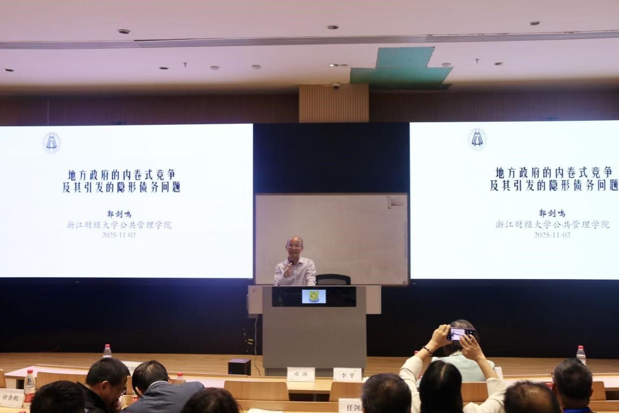 浙江财经大学名誉院长郭剑鸣教授以《地方政府的内卷式竞争、内卷式治理及其引发的债务问题》为题,系统梳理了地方政府在发展竞争中陷入内卷的表现形态,深入分析了内卷式治理对资源配置效率、公共服务质量的负面影响,并结合多地案例揭示了内卷化趋势与地方政府债务膨胀之间的传导机制,提出了优化考核体系、规范竞争秩序、化解债务风险的综合对策。